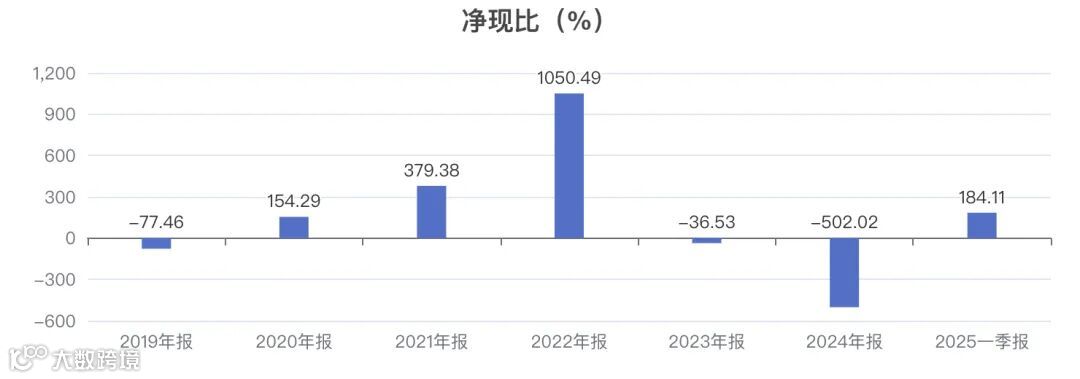 历史5年数据显示,公司的净现比呈波动趋势,历年数据为:154.29%、379.38%、1050.49%、-36.53%、-502.02%。