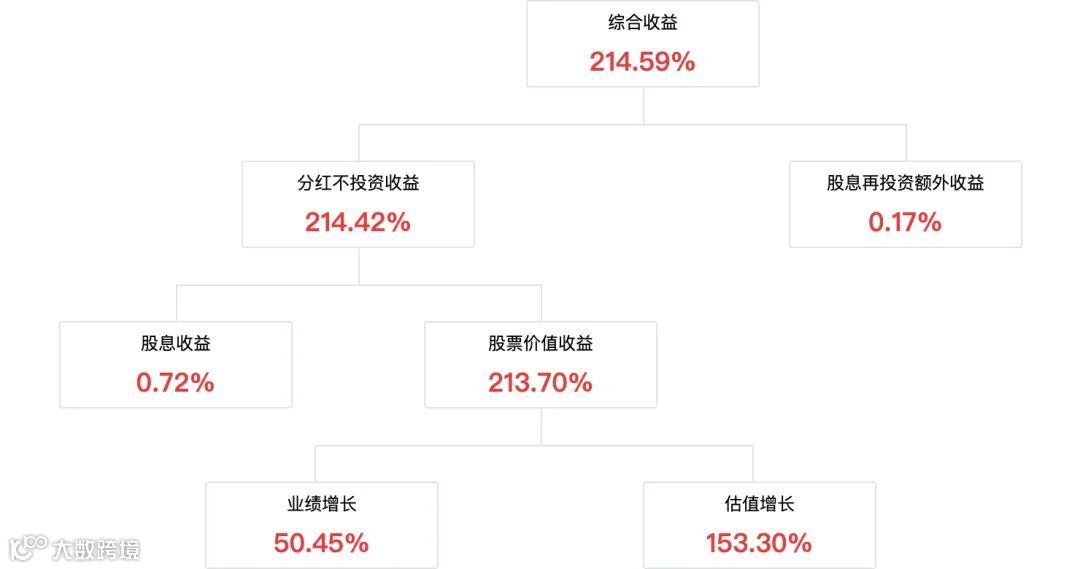 收益归因:分红不投资收益率为 214.42%,其中股息收益率为 0.72%,股票价值收益率为 213.70%:50.45% 来自业绩增长,163.25% 来自估值提升。