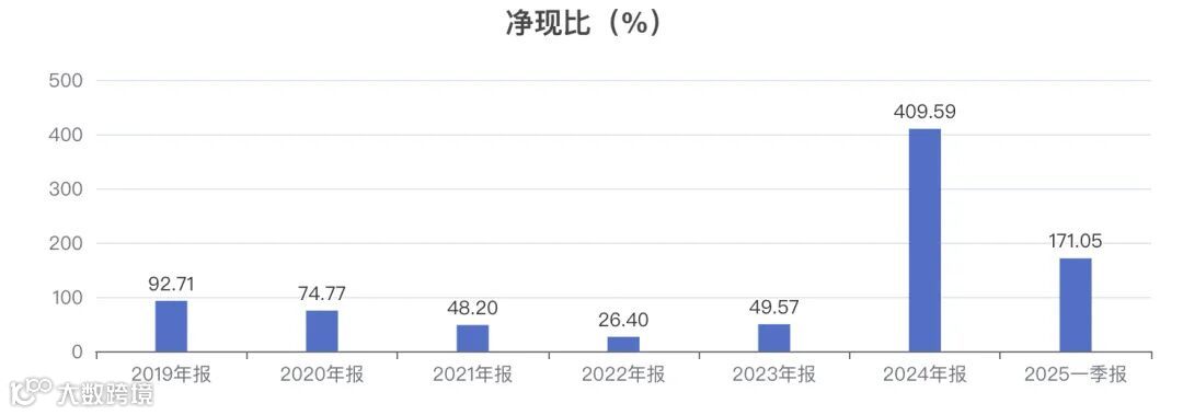 历史5年数据显示,公司的净现比呈波动趋势,历年数据为:74.77%、48.20%、26.40%、49.57%、409.59%。