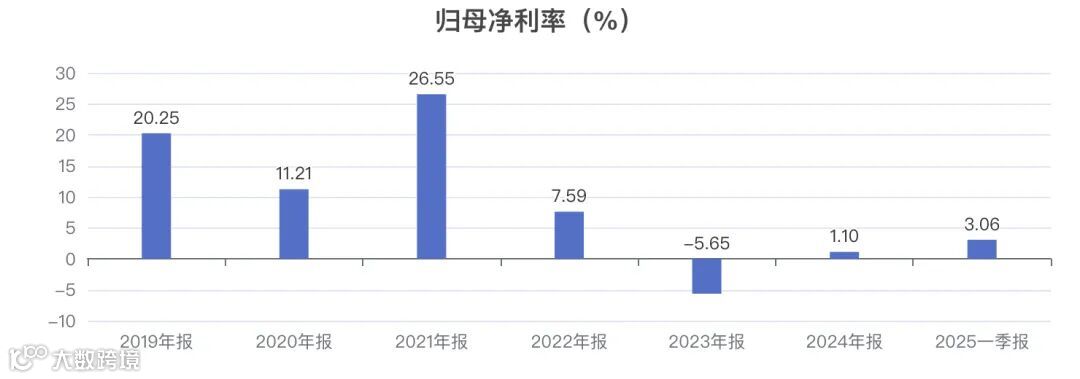 近5年归母净利率从 20.25% 变为 1.10%。 -