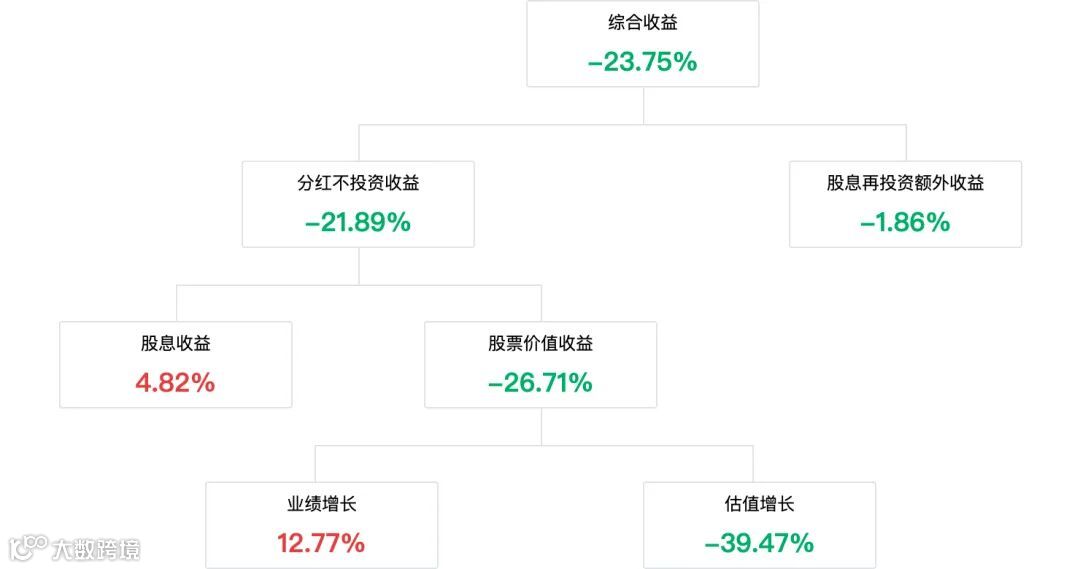 收益归因:分红不投资收益率为 -21.89%,其中股息收益率为 4.82%,股票价值收益率为 -26.71%:12.77% 来自业绩增长,-39.47% 来自估值提升。