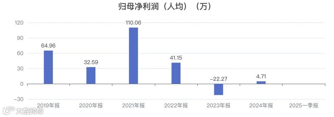 近5年人均归母净利润从 64.96万变为 4.71万。
