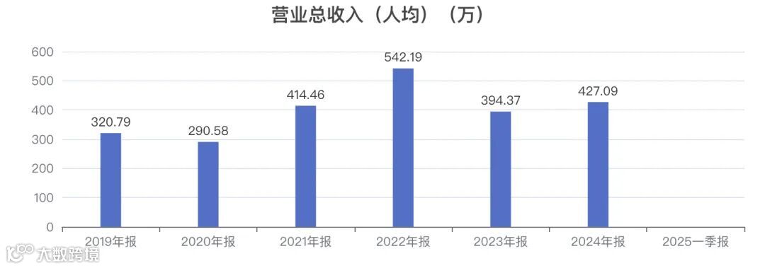 近5年人均营业总收入从 320.79万变为 427.09万。