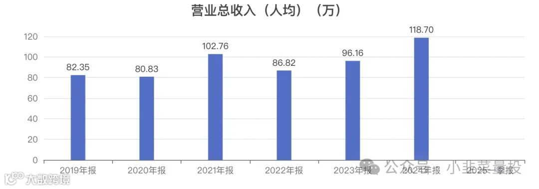 近5年人均营业总收入从 82.35万变为 118.70万。