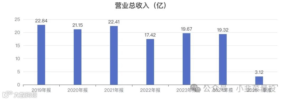 近5年营业总收入从 22.84亿降低至 19.32亿,降低了 15.41%,年化复合变动率 -3.29%。 -