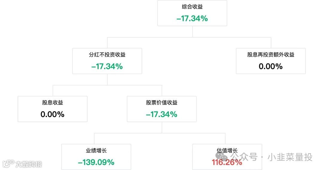 收益归因:分红不投资收益率为 -17.34%,其中股息收益率为 0.00%,股票价值收益率为 -17.34%:-139.09% 来自业绩增长,121.75% 来自估值提升。