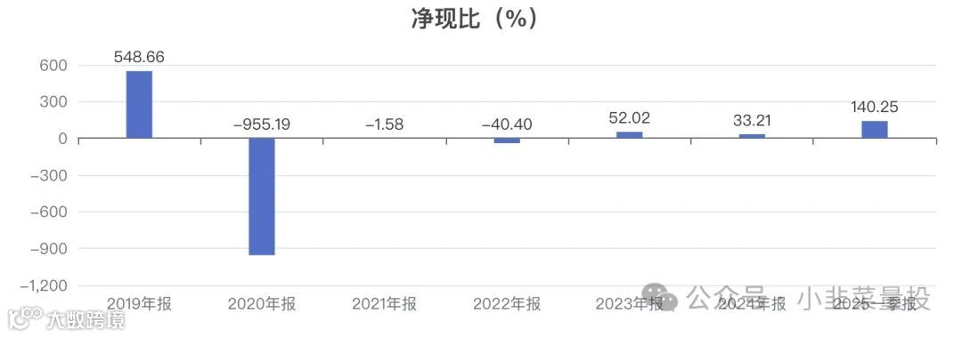 历史5年数据显示,公司的净现比呈波动趋势,历年数据为:-955.19%、-1.58%、-40.40%、52.02%、33.21%。