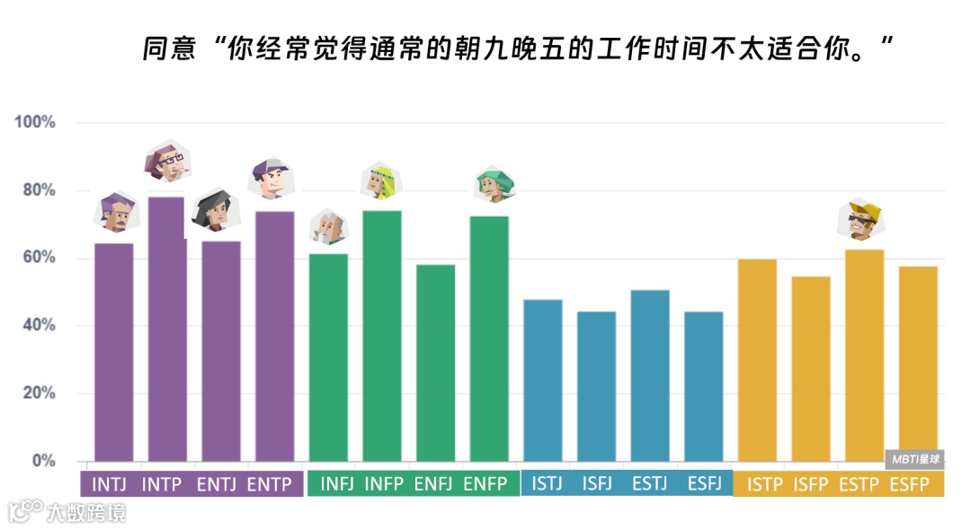 有趣的数据:NP类型也是最可能认同“朝九晚五的工作时间不适合自己”类型(INTP和INFP同意率最高)。