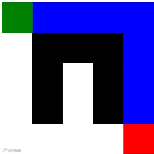 这是A*算法在一个5x5网格上的可视化结果。在图中:绿色方块表示起点位置。红色方块表示目标位置。黑色方块表示障碍物。蓝色方块表示A*算法找到的从起点到目标的最短路径。A*算法成功地绕过障碍物,找到了一条从起点到目标的最短路径。