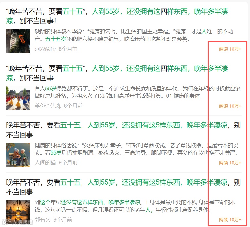 今天,群里有个一直在做中老年情感号的创业者小林发来消息:“我熬了3个通宵写的再婚选题,阅读量刚过500;隔壁账号随便发篇《60岁后,别和这3人走太近》,10分钟就破10W+,凭什么?”