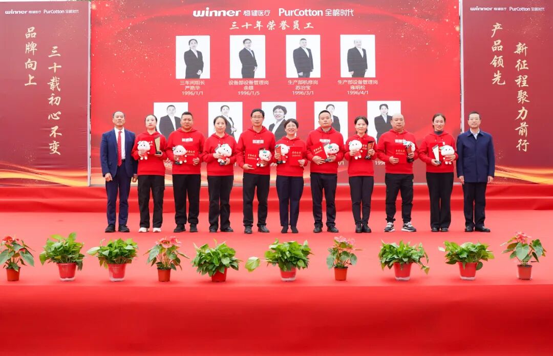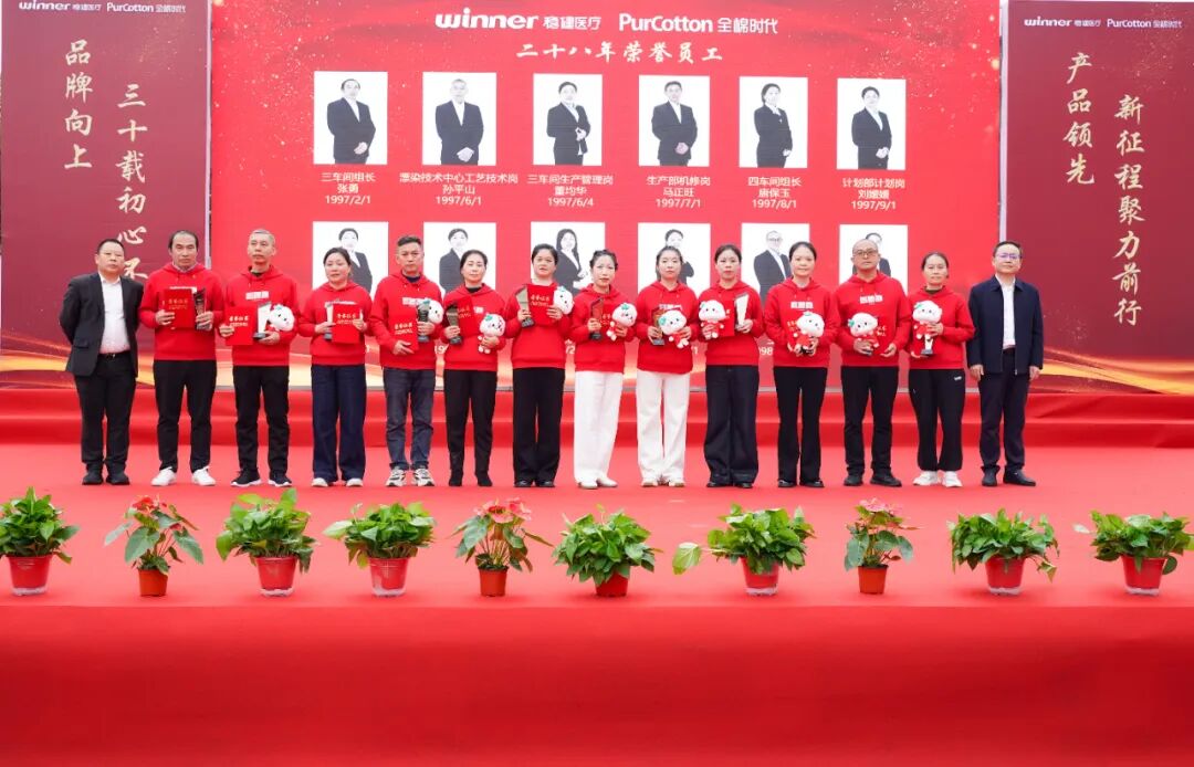 三十载成就,离不开每一位员工的坚守。在庄重的颁奖环节,公司先后为32名25年、28年、30年荣誉员工以及5名特别贡献奖获得者颁奖。从青丝到白发,从基层到骨干,他们将最好的年华融入了企业成长的年轮。特别贡献奖获得者——骆平、马军娥、张燕、纪华、龙友枝五位历任领导,作为荆门稳健的奠基人与引路人,从董事长李建全手中接过了这份代表着荆门稳健全体员工心意的奖杯及寓意温暖的“棉宝宝”,更是让现场情谊涌动,感人至深。