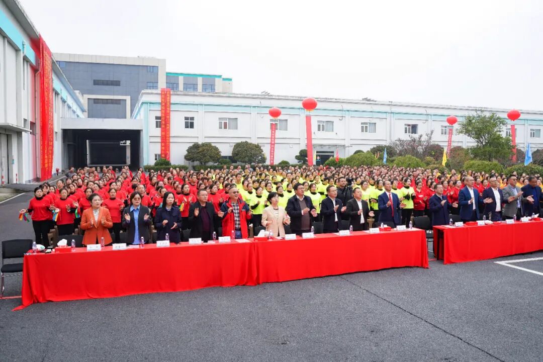 活动在生产车间四大方阵的士气展示中拉开帷幕。“医疗先锋队”、“全棉卓越队”、“服装匠心队”、“服装数智队”依次登场。他们步伐铿锵、口号嘹亮,用亲手染制的彩带、花束和铃铛,舞出蓬勃朝气,展现了荆门稳健人精益求精、团结协作的工匠精神,现场掌声雷动,气氛热烈。