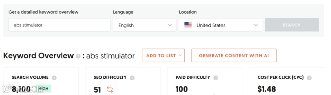 abs stimulator其实是属于肌肉电刺激/ Electrical Muscle Stimulation里面的一个细分,这个类目下面也有非常多的细分,Electrical Muscle Stimulation简称EMS, 美国市场月均搜索量是9900,预估的广告cpc是2.21美金。