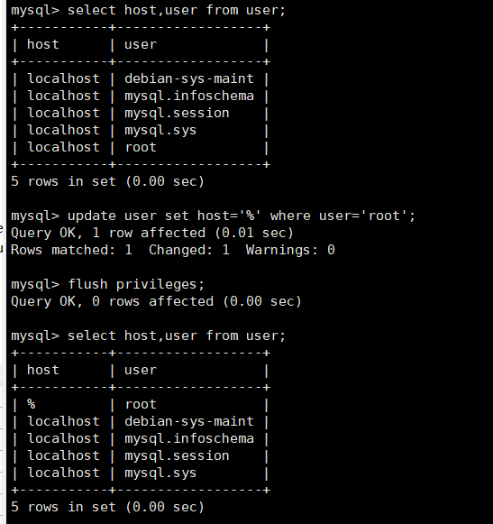 发现root用户的访问权限是localhost,需要修改host为%,输入命令