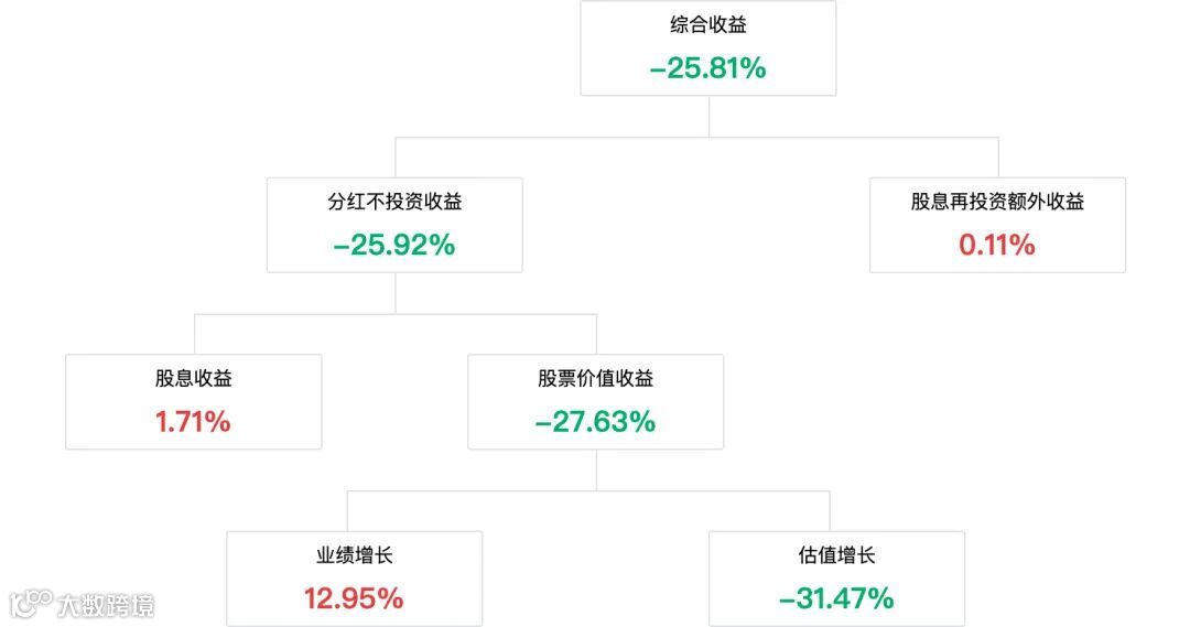收益归因:分红不投资收益率为 -25.92%,其中股息收益率为 1.71%,股票价值收益率为 -27.63%:12.95% 来自业绩增长,-40.58% 来自估值提升。