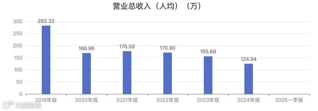 近5年人均营业总收入从 282.33万变为 124.94万。