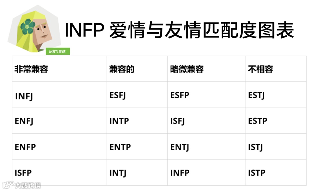 因此他们往往和直觉-情感型人格最兼容,以下是调停者的性格的爱情和友情兼容匹配表: