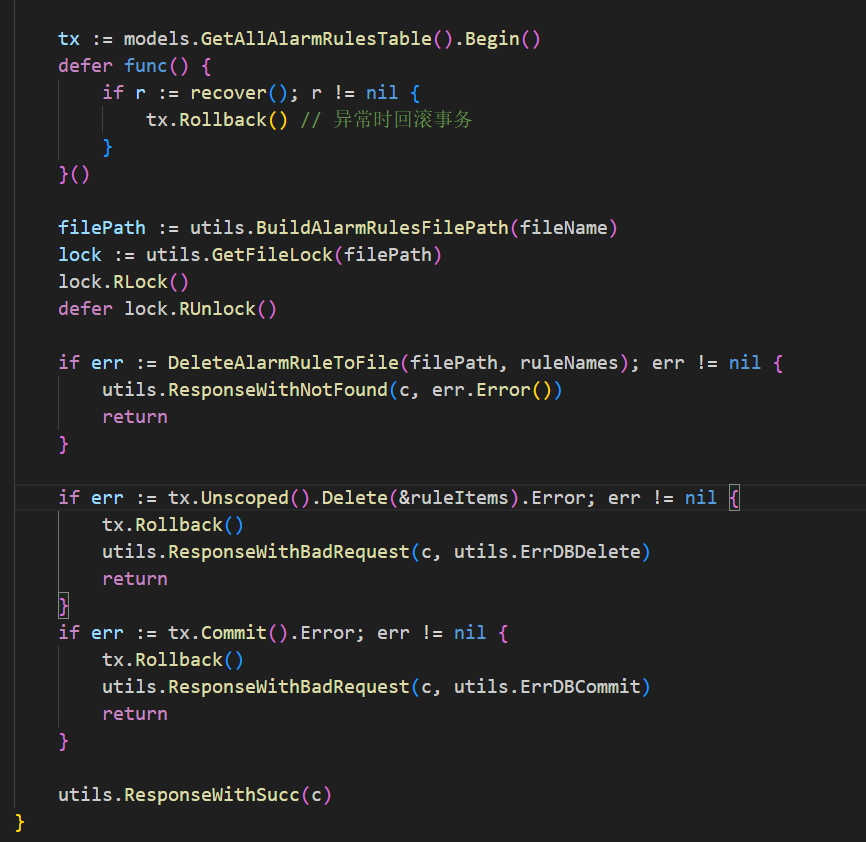 “使用GORM编写一个事务函数,删除ID=5的MonitorRulesItem记录,要求包含错误处理、物理删除,并适配现有项目结构”