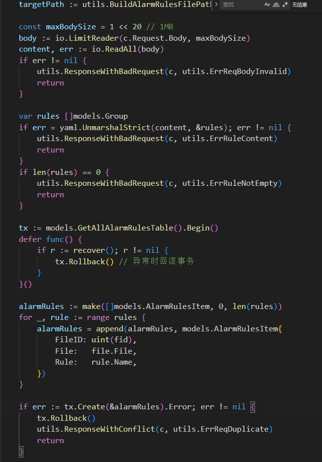 添加的yaml文件解析前置步骤清晰,首先确认文件是否存在,然后限制文件大小进行读取以防崩溃,用严格模式解析yaml文件杜绝了格式问题。将所有数据库操作放在事务内实现,满足提示词要求,因此采用该结果,适配实际代码:通过智能对话方式实现代码补全的内容,采纳率达70%以上。