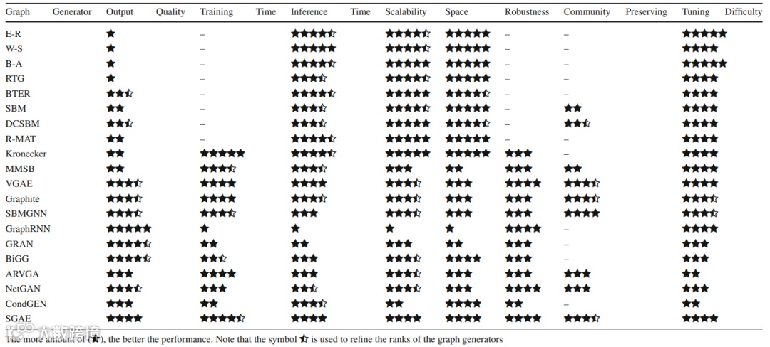该表格给出了不同任务要求下的各个图生成器的表现水平,后续研究人员可以根据不同的需求选择合适的生成模型。
