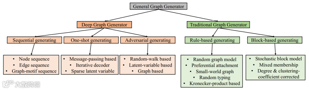 为更深入理解代表性图生成器的技术特点,在本小节中我们提供一个更为复杂且系统的分类体系(如图1所示),该体系包含5个主类和17个子类。