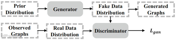 生成对抗网络 [21](Generative Adversarial Networks, GANs)的核心思想是通过判别器生成高质量且鲁棒的伪造数据。如图3所示,GAN基图生成器的关键在于:使用图生成器建立从随机变量到图伪隐变量的映射,并将其与真实图的编码隐变量一同输入判别器。这些模型的目标是使生成器稳定运行并产生逼真的隐变量,进而解码以模拟现实图。以下介绍三种代表性GAN基生成器。