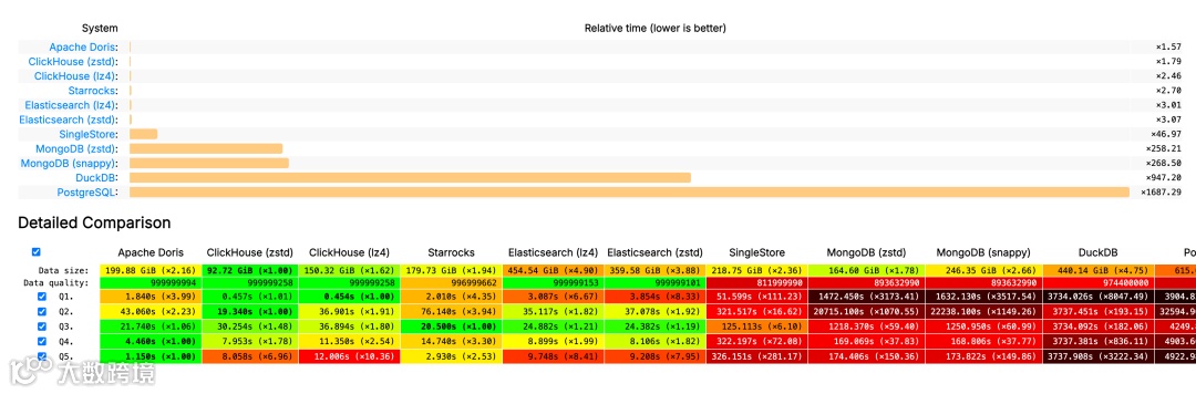 Doris VARIANT 的卓越性能也在业界公开的 JSONBench 半结构化数据测试中得到了充分验证:冷查询性能排名第一、热查询性能位居第二,全面领先 ClickHouse、Elasticsearch 等一众知名产品。其查询速度约是 MongoDB 的 164 倍、PostgreSQL 的 1074 倍。此外,对 Doris、 Snowflake 进一步对比, 不管是在冷查询还是热查询中,Doris 相较 Snowflake 有约 2-5 倍的性能优势。具体可见下图: