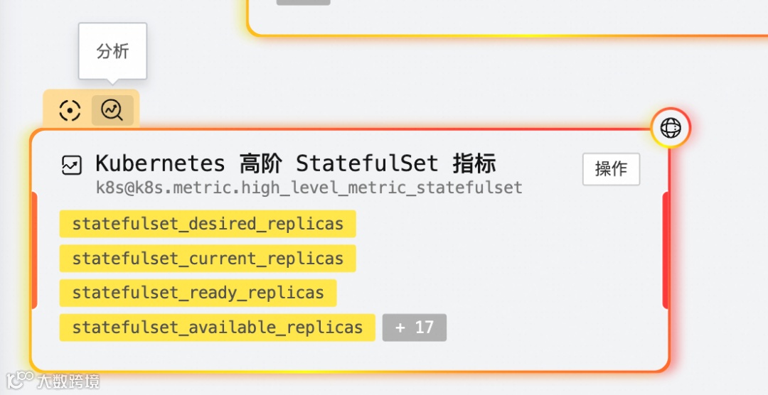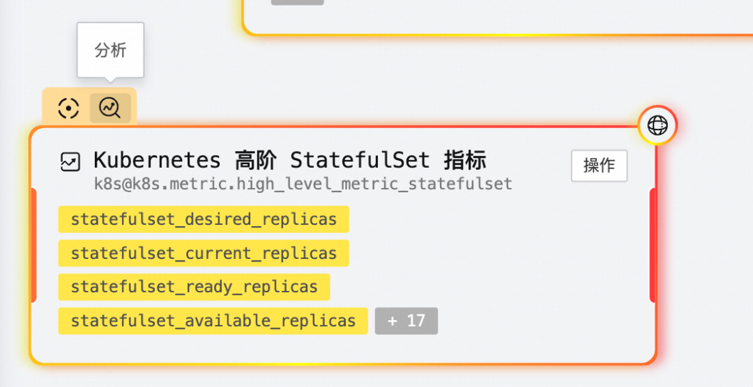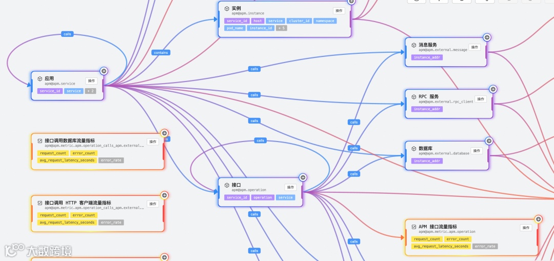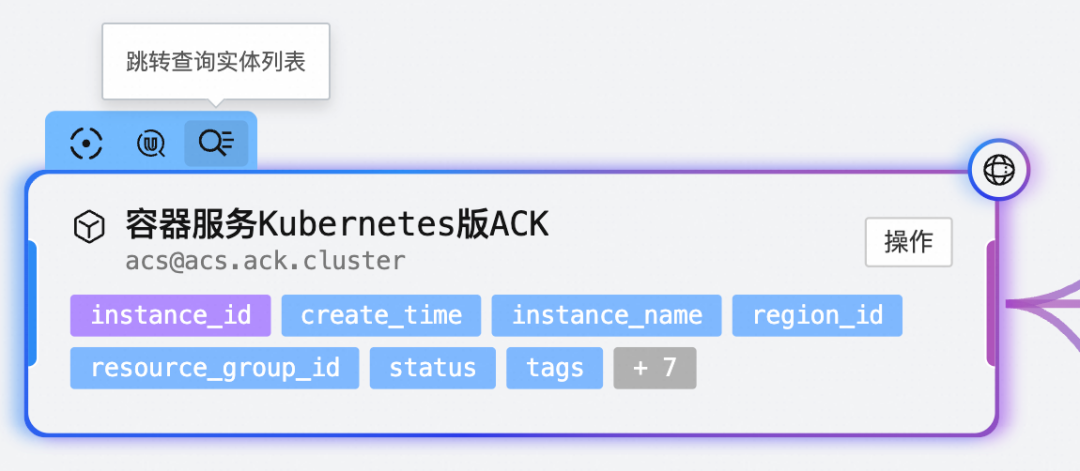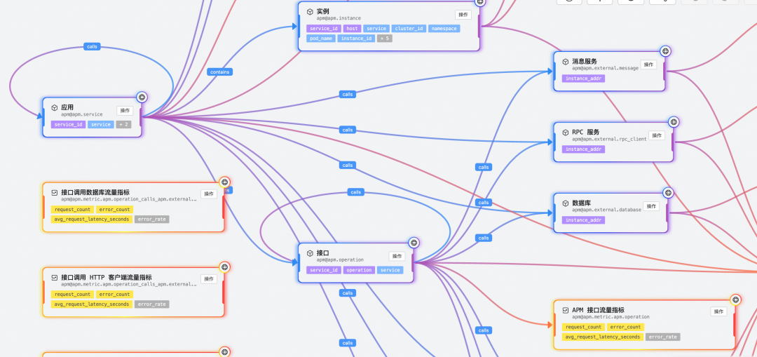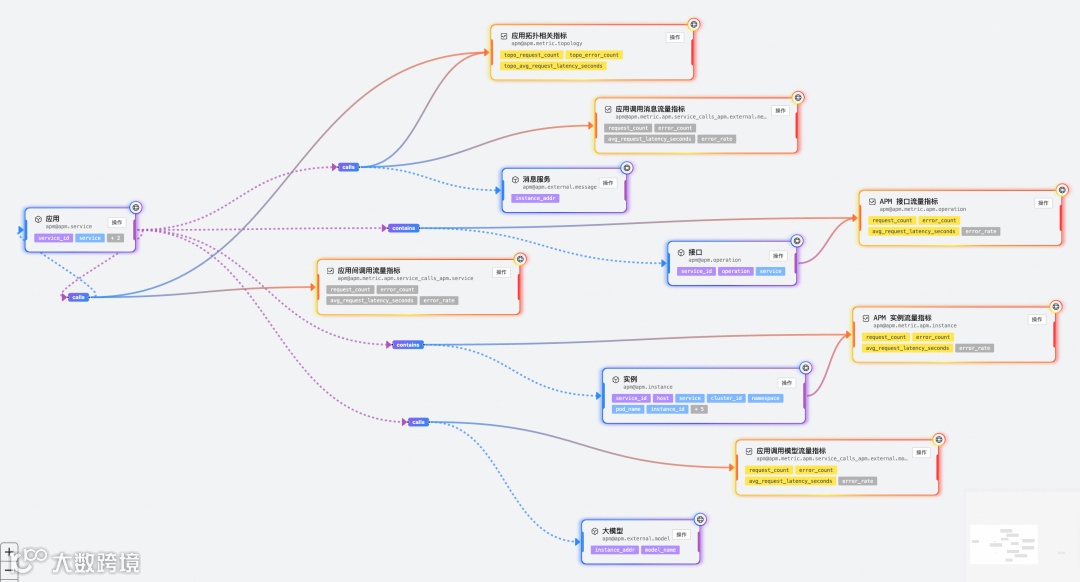 不同类型的节点还有各自的特有操作。例如,entity_set 节点可能有“查询实体列表”、“快速查询”等操作,metric_set 节点有“分析”操作,log_set 节点有“跳转日志查询”操作等。这些操作将建模和分析功能无缝集成,让用户可以在建模的同时直接查看和分析数据。