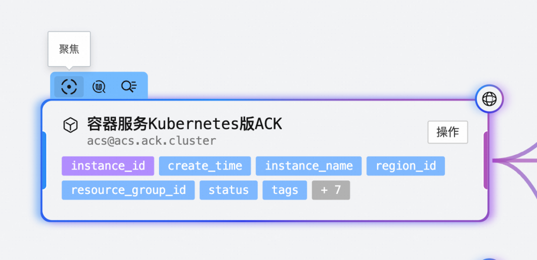 每个节点在鼠标悬停时,左上角都会显示一个操作菜单。这个菜单提供了该节点类型特有的快捷操作。所有节点都至少有一个“聚焦”操作,点击后会将该节点设为聚焦筛选条件,画布会自动调整视图,只显示该节点及其相关的邻居节点。