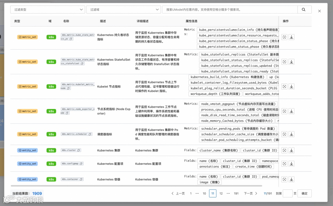 概览页还提供了一个重要的导航功能:UModel 列表视图。点击“查看 UModel 列表”按钮,会进入一个表格视图。这个表格不仅展示所有 UModel 元素的通用信息(名称、域、类型等),还根据不同的元素类型展示专属的关键信息。例如,对于 metric_set,会展示其包含的指标数量;对于 entity_set,会展示实体类型等。表格支持多维度的筛选,包括按类型、按域筛选,还支持全文搜索,用户可以在搜索框中输入关键词(支持中文名、英文名或 ID),系统会在所有字段中搜索匹配的内容。