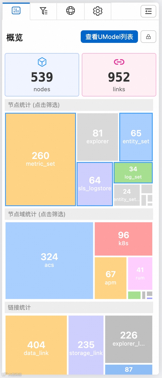 概览页提供了当前 Workspace 中 UModel 数据的全局统计信息。这些统计信息分为两个维度:节点统计和链接统计。节点统计展示各类 UModel 元素(entity_set、metric_set 等)的数量分布,链接统计则展示了它们之间的关联关系数量。特别需要注意的是,entity_set_link 类型在统计中同时算作节点和链接,因为它既是一个节点实体,又代表了一种关联关系。