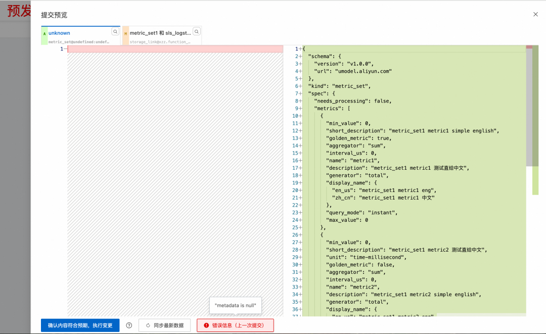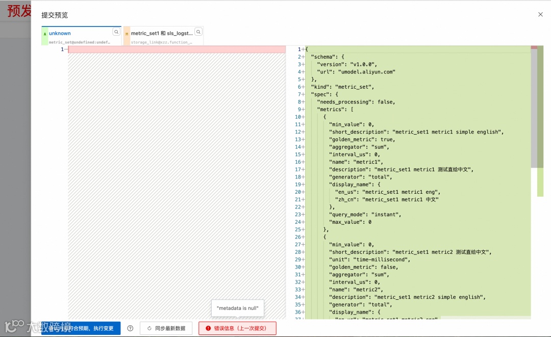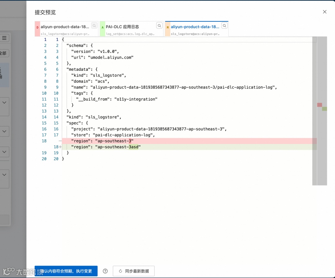 在提交预览界面,用户可以点击每个标签页右上角的定位按钮,将对应的元素在画布上进行聚焦定位,这样可以再次确认修改是否正确。如果担心在编辑过程中,Workspace 中的数据被其他用户修改,可以点击“同步最新数据”按钮,系统会重新获取最新数据并更新 Diff 视图,这样用户就能看到是否有新的冲突。