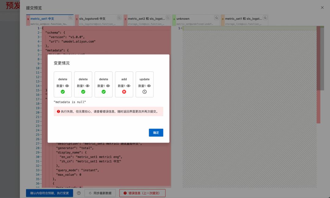 提交过程中,已经成功提交的批次会从预览列表中移除,失败的批次会保留并显示错误信息。即使关闭提交对话框,用户也可以通过操作工具栏再次查看提交状态和错误信息,直到所有变更都成功提交完成。