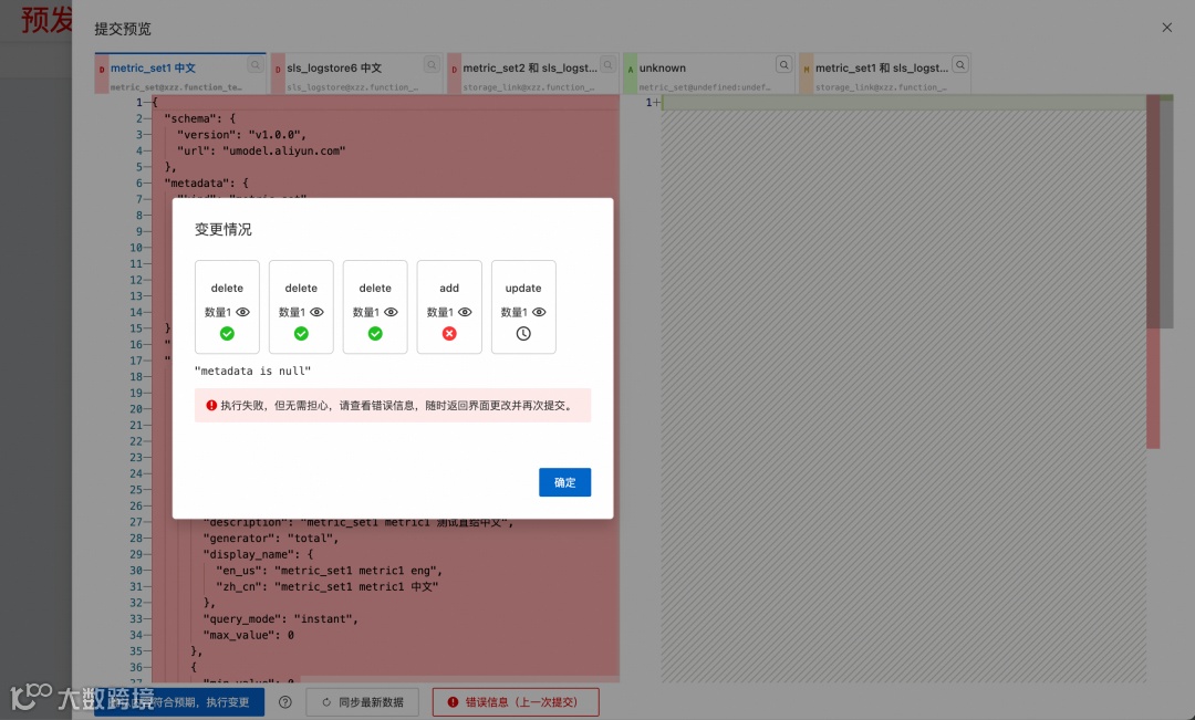 如果所有变更都符合预期,点击“执行变更”按钮,系统会开始批量提交。提交会按照删除、添加、修改的顺序执行,删除操作每次只提交一个元素(最保守的策略),添加和修改操作每次批量提交 10 个元素。如果某个批次执行失败,后续批次会停止执行,并显示详细的错误信息。用户可以根据错误信息修正问题后,重新提交剩余的变更。