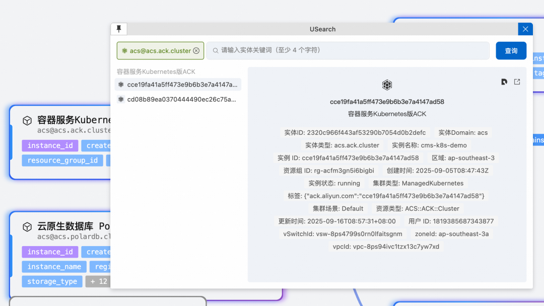 快速查询(Usearch)功能让用户能够直接在画布上查询 entity_set 中包含的实体数据。点击操作菜单中的“快速查询”,会打开一个查询面板。在这个面板中,用户可以输入查询条件(基于实体的字段),系统会实时返回匹配的实体列表。查询结果支持进一步筛选和排序,用户可以快速找到感兴趣的实体。
