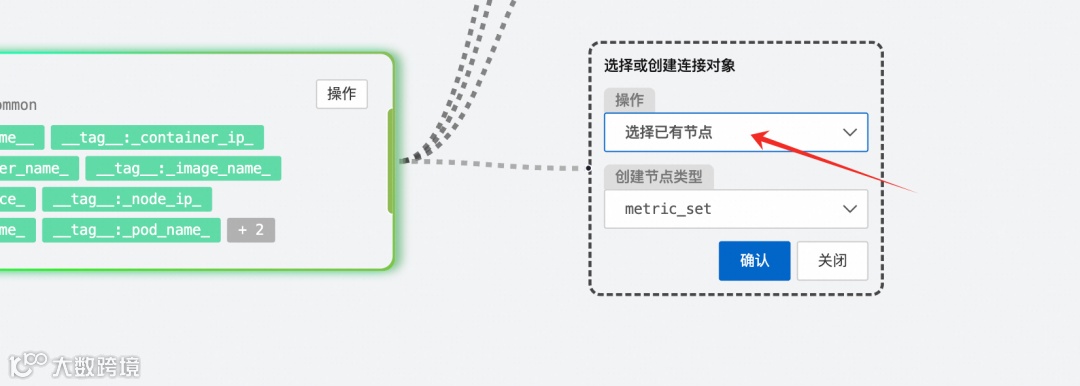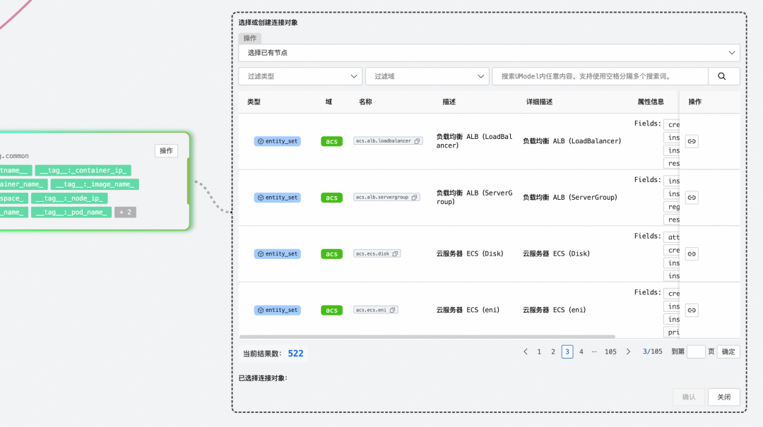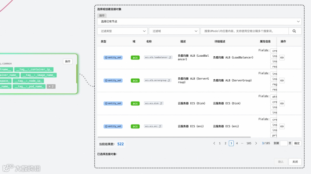 创建节点按钮是快速建模的入口。点击后会弹出一个对话框,若点击创建新节点,则让用户选择要创建的节点类型(entity_set、metric_set、log_set 等)。创建完成后,新节点会自动出现在画布中央,并且会自动聚焦和选中,用户可以立即开始编辑。