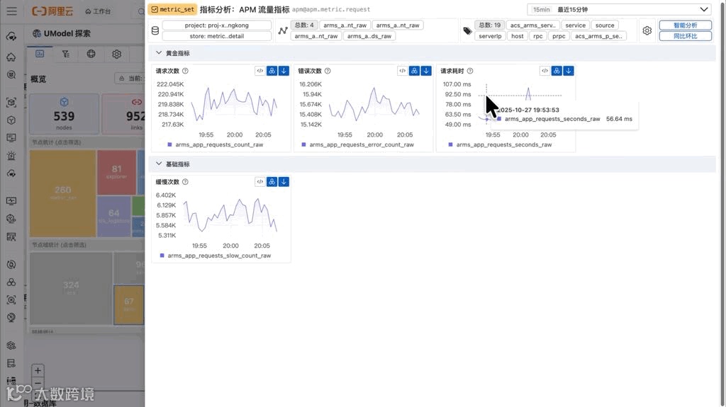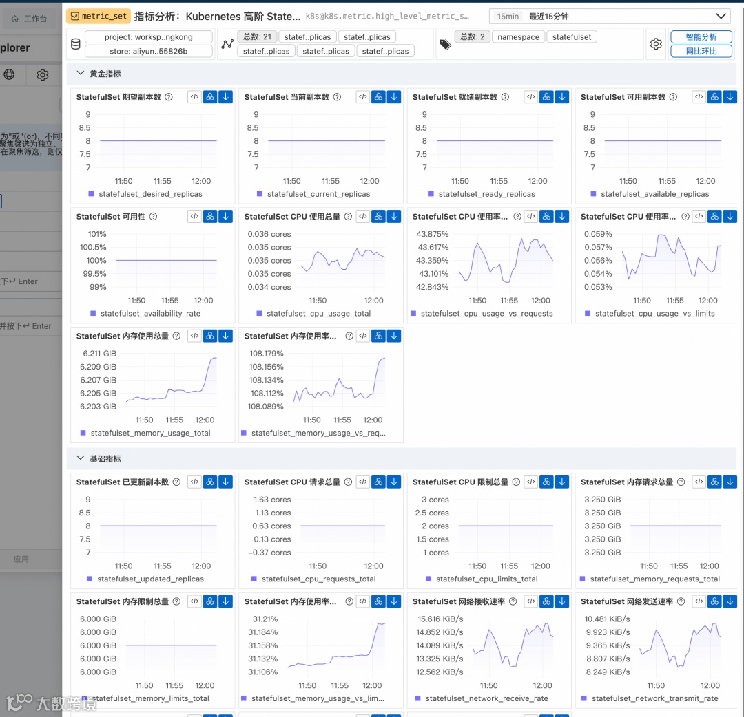 metric_set 节点代表指标数据的集合,是 UModel Explorer 中最具分析能力的节点类型。点击 metric_set 节点的“分析”按钮,会打开一个大型的分析面板,集成完整的 metric_set Explorer 智能分析功能。