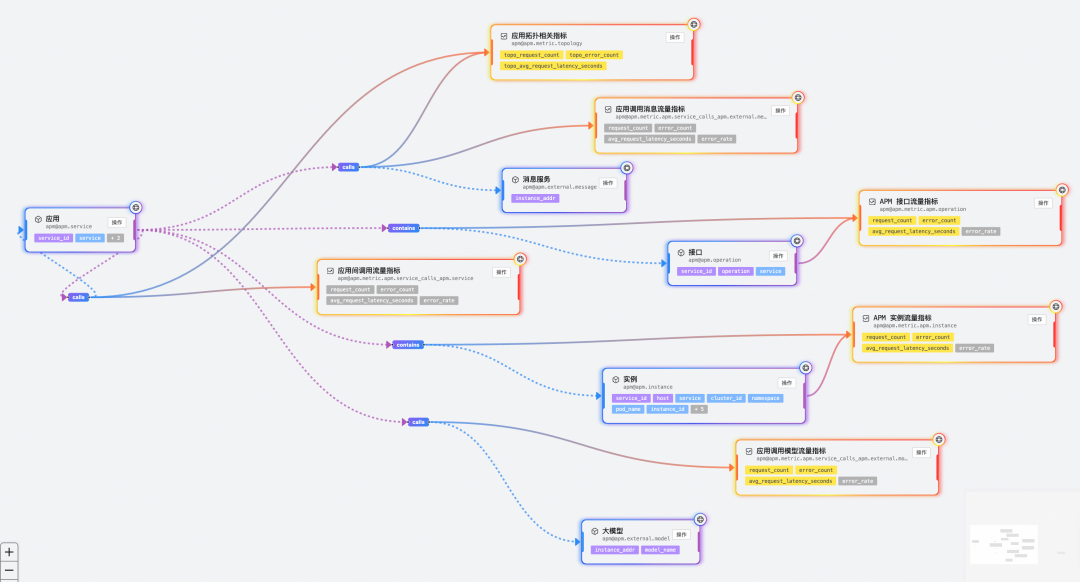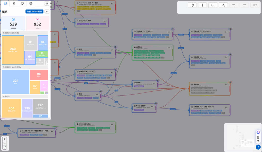 UModel Explorer 作为可观测 2.0 平台的核心组件,提供了统一的可观测数据建模能力。它支持多种数据模型类型,包括 entity_set(实体集)、metric_set(指标集)、log_set(日志集)、trace_set(追踪集)等,以及它们之间的关联关系。这种统一的建模框架,让原本分散在不同系统中的数据有了统一的管理视角。