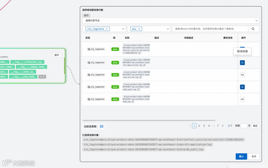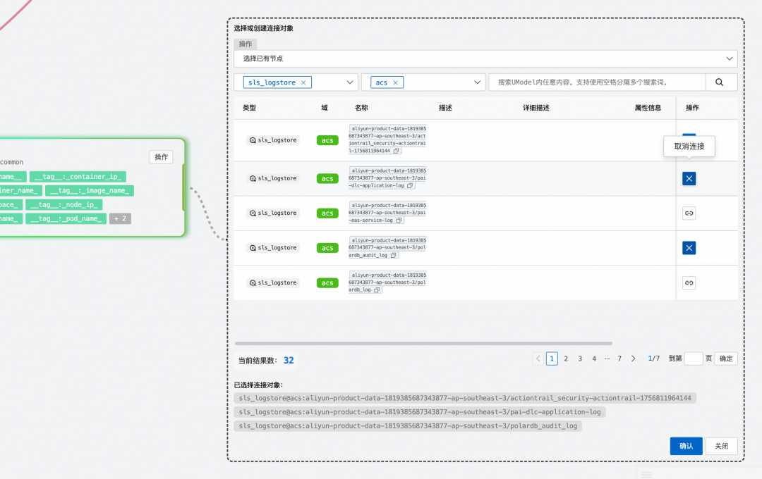 第一种是批量连接模式。当用户从一个节点开始连线,但拖动到画布空白区域时,会弹出一个“选择或创建链接对象”的虚拟节点对话框。在这个对话框中,用户可以搜索并选择多个已有的节点,一次性创建多条边。这对于需要将一个节点连接到多个节点的情况特别有用。例如,一个 entity_set 可能需要同时连接到多个 metric_set,使用批量连接模式可以一次性完成所有连接。