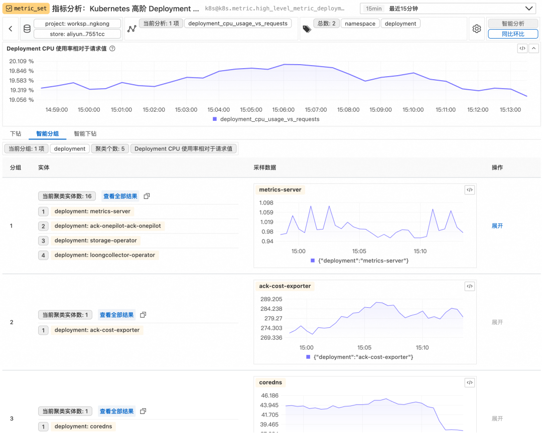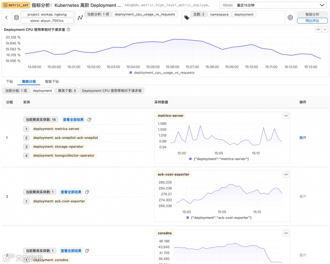 智能分组功能基于时序聚类算法,将所有时间序列按照形态相似度进行聚类。这让用户能够发现数据中的模式或群组,比如高负载、中负载、低负载三类实例,便于进行容量规划或资源优化。
