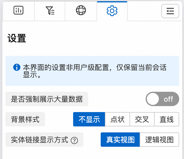 最重要的设置是“强制全量显示”开关。当画布上的节点数量超过一定阈值(默认 50 个)时,系统会在页面底部显示提示,告知用户当前只展示了部分节点。这是出于性能考虑的设计,因为当节点数量很大时,全部渲染会导致严重的卡顿,影响使用体验。如果用户确实需要查看全部节点,可以在设置页打开“强制全量显示”开关。