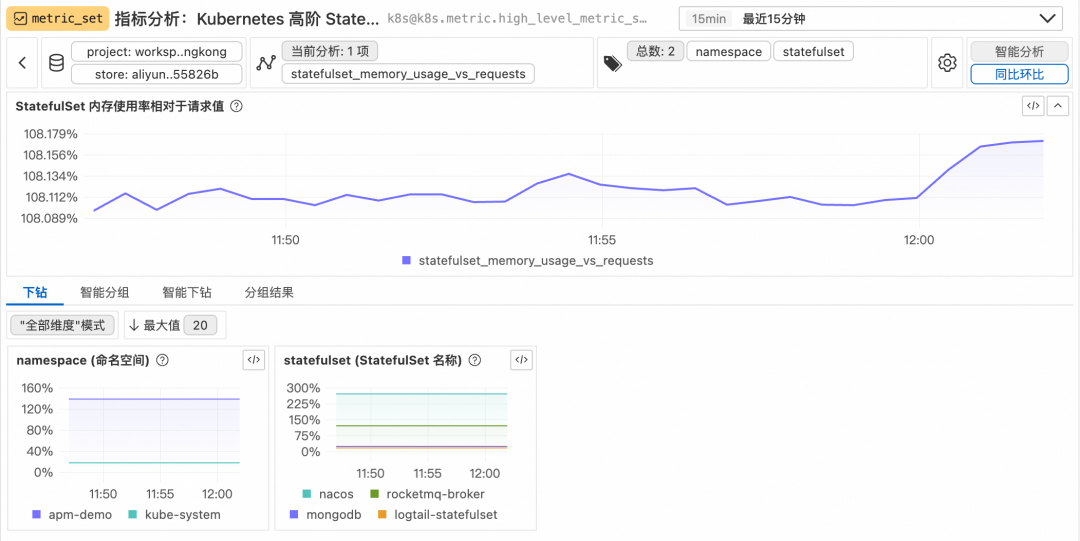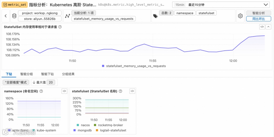 分析面板占据屏幕 90% 的宽度,提供了充足的空间来展示图表和分析结果。面板顶部集成了时间选择器,用户可以选择要分析的时间范围。面板内部包含了指标概览、下钻分析、智能分组、智能下钻等多个分析标签页。