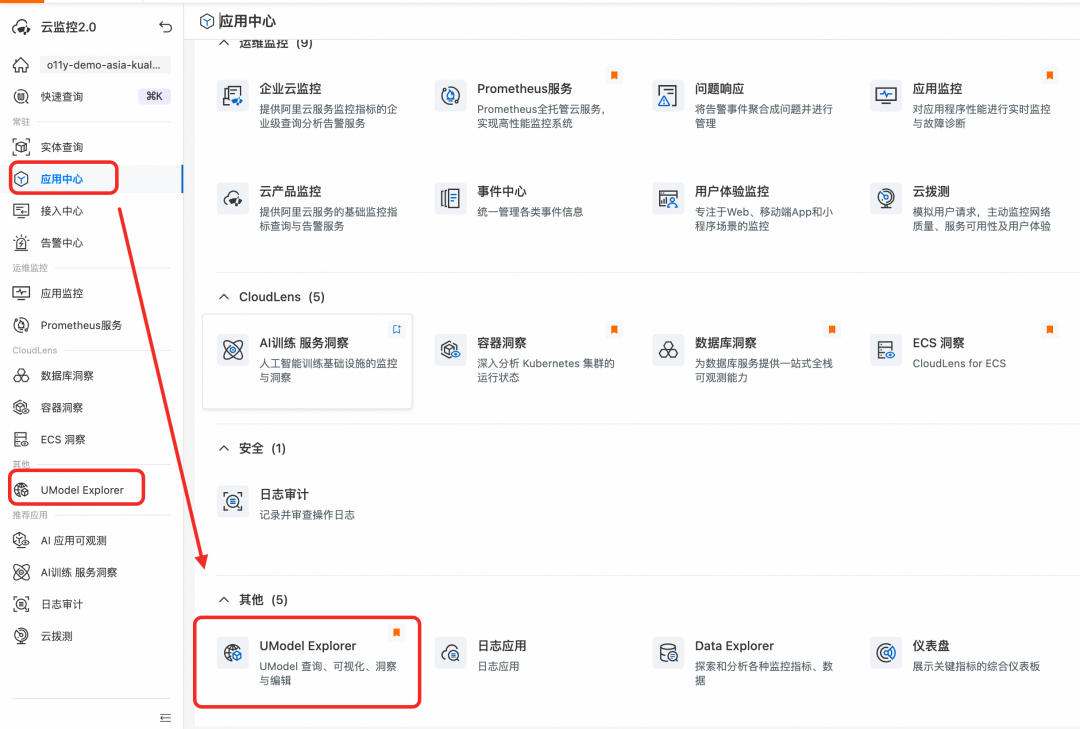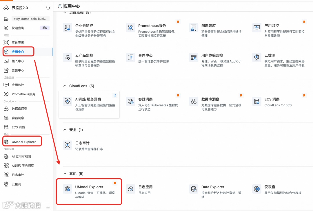 进入系统的方式很简单:进入阿里云云监控 2.0 产品控制台后选择一个Workspace并进入,在“应用中心”找到 UModel Explorer,推荐将其固定到 Workspace App 侧边栏,这样可以在日常工作中快速访问。首次进入时,系统会自动加载当前 Workspace 中的所有 UModel 数据,并以图形化的方式展示在画布上。