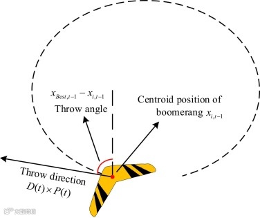 其中, 是以第 个回旋镖当前位置为中心生成的椭球体各维半轴长度组成的向量, 是第 个回旋镖的当前位置, 是当前最优个体的位置, 是 内的随机数。