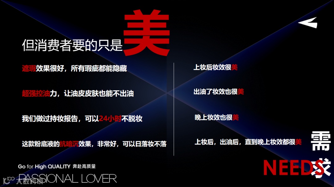 消费者的需求是遮瑕效果很好,就是想说上妆之后妆效非常美;超强的控油能力,那就是即使出了油,妆效也非常美;24小时不脱妆、抗暗沉效果好,那就是即使到了晚上妆效都非常美。