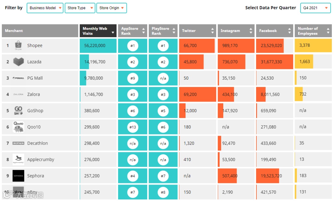 根据iPrice 2021年第四季度数据,Shopee、Lazada和PG Mall在App下载量与网站流量方面领先,紧随其后的是Zalora、GoShop、Qoo10、Decathlon、Applecrumby、Sephora和eBay[k]。