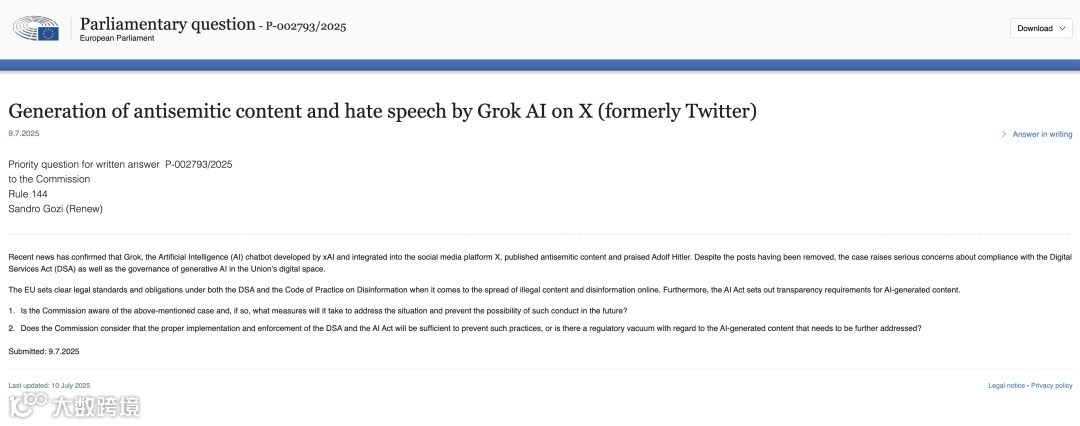 就目前情况来看,全球监管环境对开放式模型的要求逐步趋严,xAI 在合规性议题上正处于冲突边缘,面临着越来越直接的制度摩擦。欧盟基本不会接受 Grok 的开放模式,例如,委员会发言人托马斯·雷尼尔就此前 Grok 的价值观偏移事件表示,欧盟正在积极与 X 公司联系,「该公司有义务对与 Grok 相关的风险采取行动,Grok 违背了欧洲的基本权利和价值观。」之后,欧洲议会还发文,直接把 Grok 事件与《数字服务法》《欧盟人工智能法案》联系起来,指出此类开放或低过滤的模型在欧盟高标准法规下面临调查与潜在执法风险。
