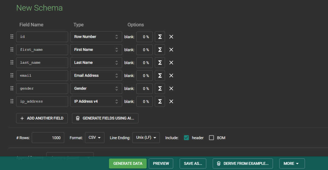 你只需访问网站,设计好 schema,然后点击“Generate Data”即可。免费版可生成最多 1,000 行数据,非常适合测试分析型 dashboard、CRM 系统或对 API 进行压测。