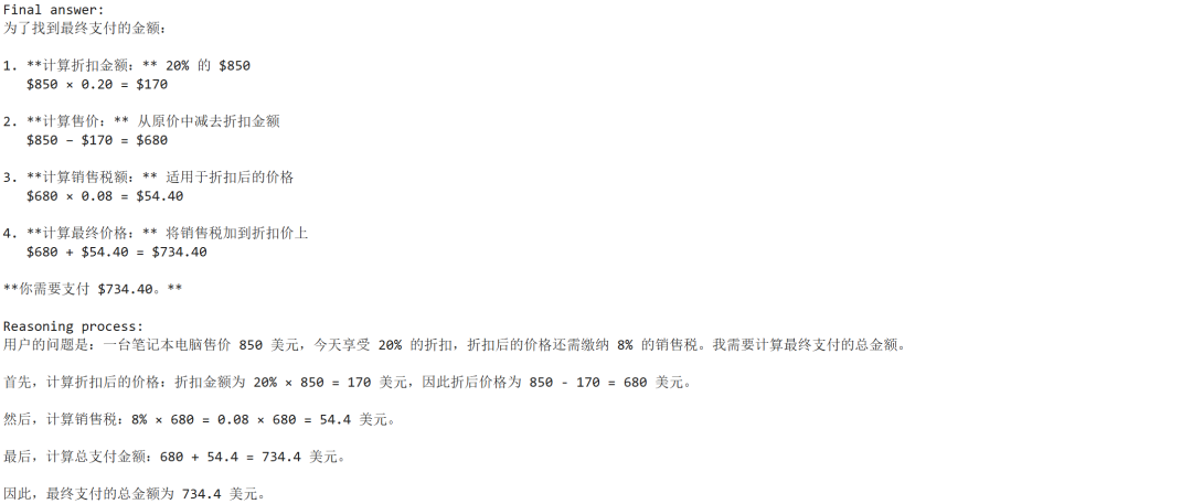下面是一个实际应用场景:假设你要计算一台售价 850 美元的笔记本电脑,在享受 20% 折扣后再缴纳 8% 销售税,你最终需要支付多少钱。通过以下 Python 代码,我们可以同时获取模型的最终答案和详细的推理过程。