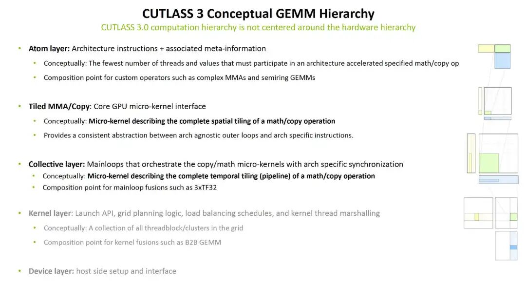 针对不同的硬件架构, 构建了一个原子层(Atom Layer),这是执行MMA指令或者COPY指令(SMEM->RF)的描述. 这里正好构成了GEMM半环代数结构和复杂的MMA计算的可组合点. 然后抽象了一个Tiled MMA/Copy层, 主要是针对矩阵分块的描述, 即空间维度(Spatial Tiling)的划分. 它的目的主要是在各种架构的原子算子层之上构建一种和硬件架构无关的抽象层. 紧接着抽象出了一个Collective层, 主要是一些时间维度(Temporal Tiling)上的对不同架构的计算/通信算子编排. 而更上的Kernel层则是对Thread/block放置的抽象, Device层则是主机调用的抽象. 第三章我们会给出一个详细的例子.